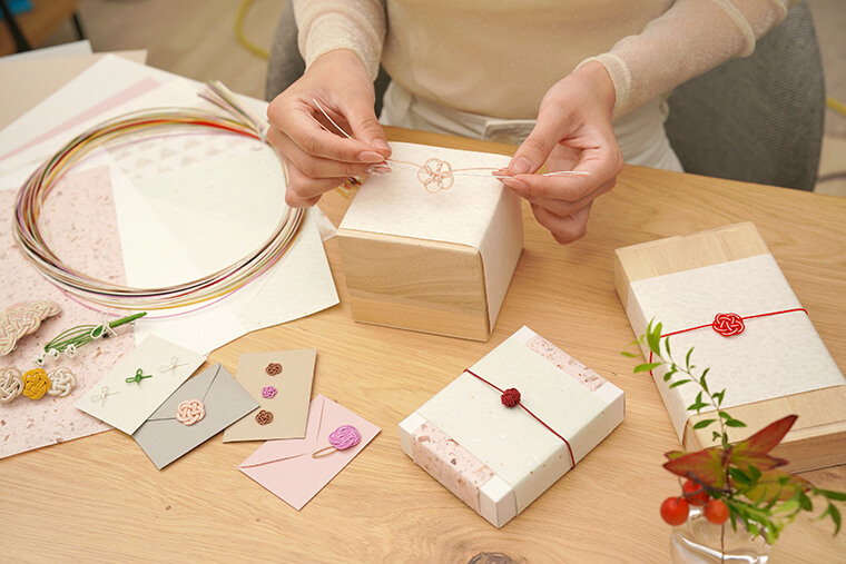 8種類の水引の結びがマスターできる水引結びのスターターキットです。さまざまなアレンジが楽しめるよう、水引きが13色、一緒にアレンジできる洋紙と和紙が11種類も入っています。ギフトラッピングから、和風・洋風のスタイリング、アクセサリーへの仕立て方まで、水引のアレンジアイデアとテクニックもマスターできます。