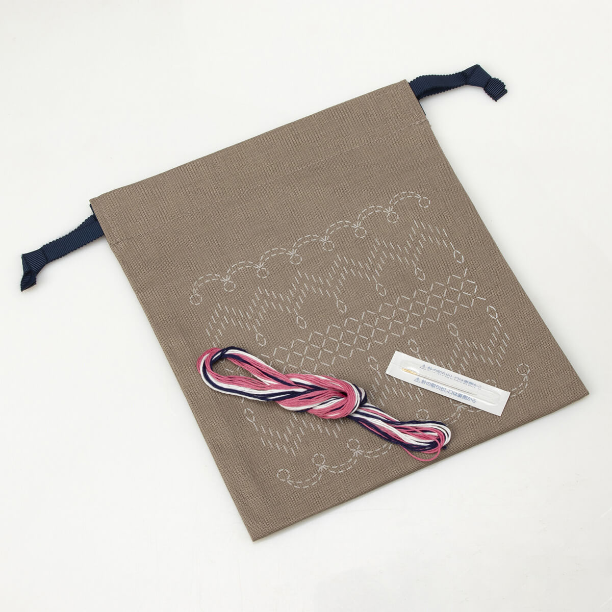 巾着の前面と後ろ面にぐるりと模様が入るので、刺し子をたっぷり楽しめるキットです。小物入れにちょうどよいサイズで、革ひものような光沢のあるコードと、模様を刺していく手順がわかる紙レシピも付いています。