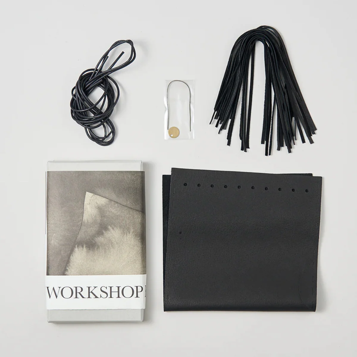 ブラックのフリンジサコッシュが作れるレザークラフトキットです。人気のレザーバッグブランド「REN」のキットなので、仕上がりはとても本格的。革ひもを結んで仕上げるので、気軽にレザークラフトが楽しめます。