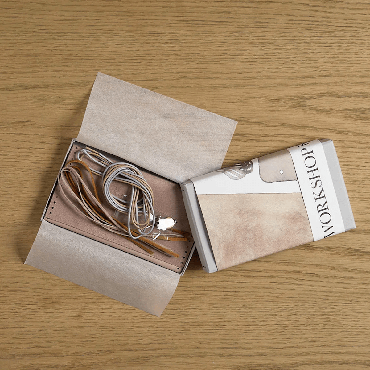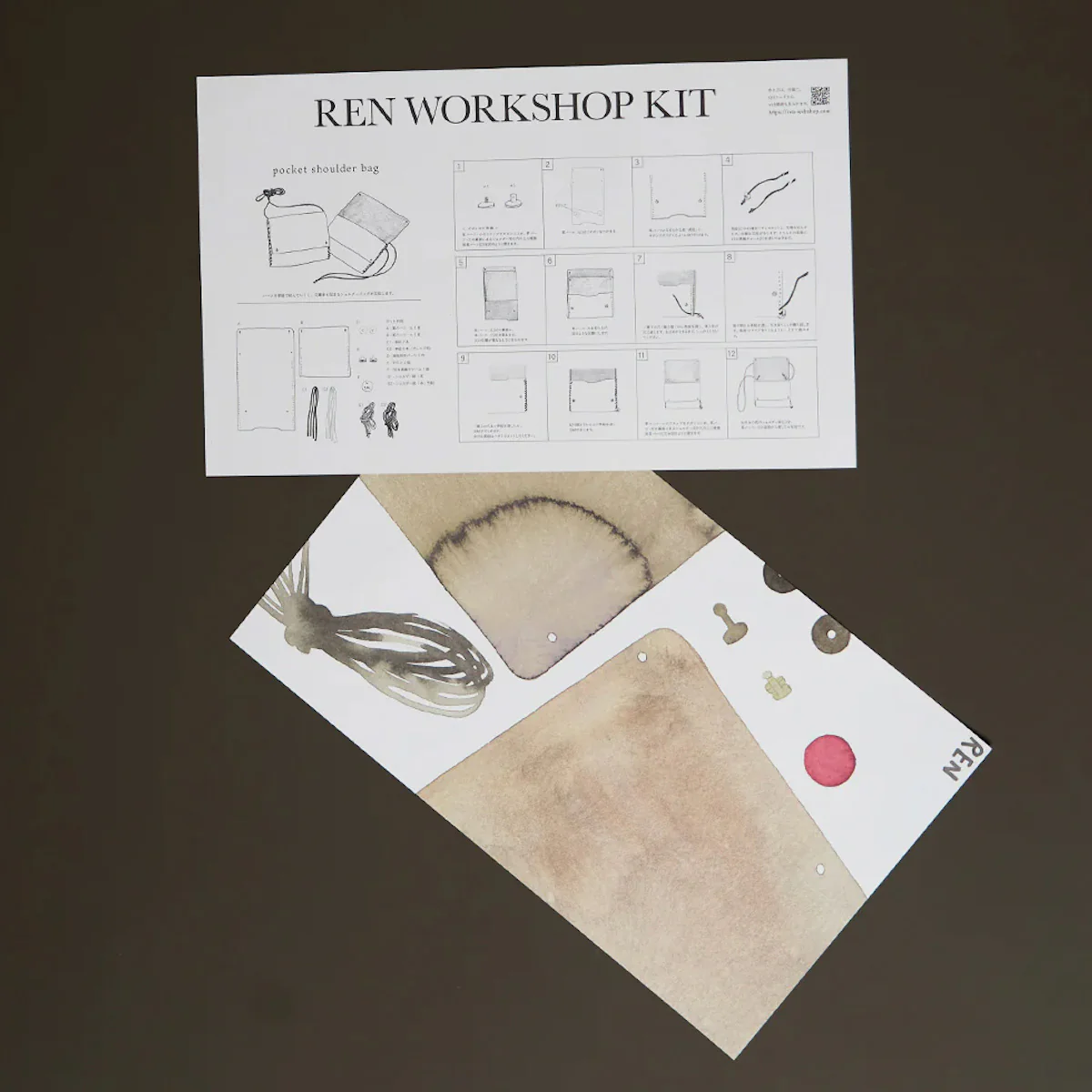 東京・蔵前発のレザーバッグブランド「REN」のレザークラフトキットです。優しい雰囲気が漂うピンクベージュのポケットショルダーが作れます。シンプルで軽やかなデザインと、使うほどに深まる風合いが魅力です。