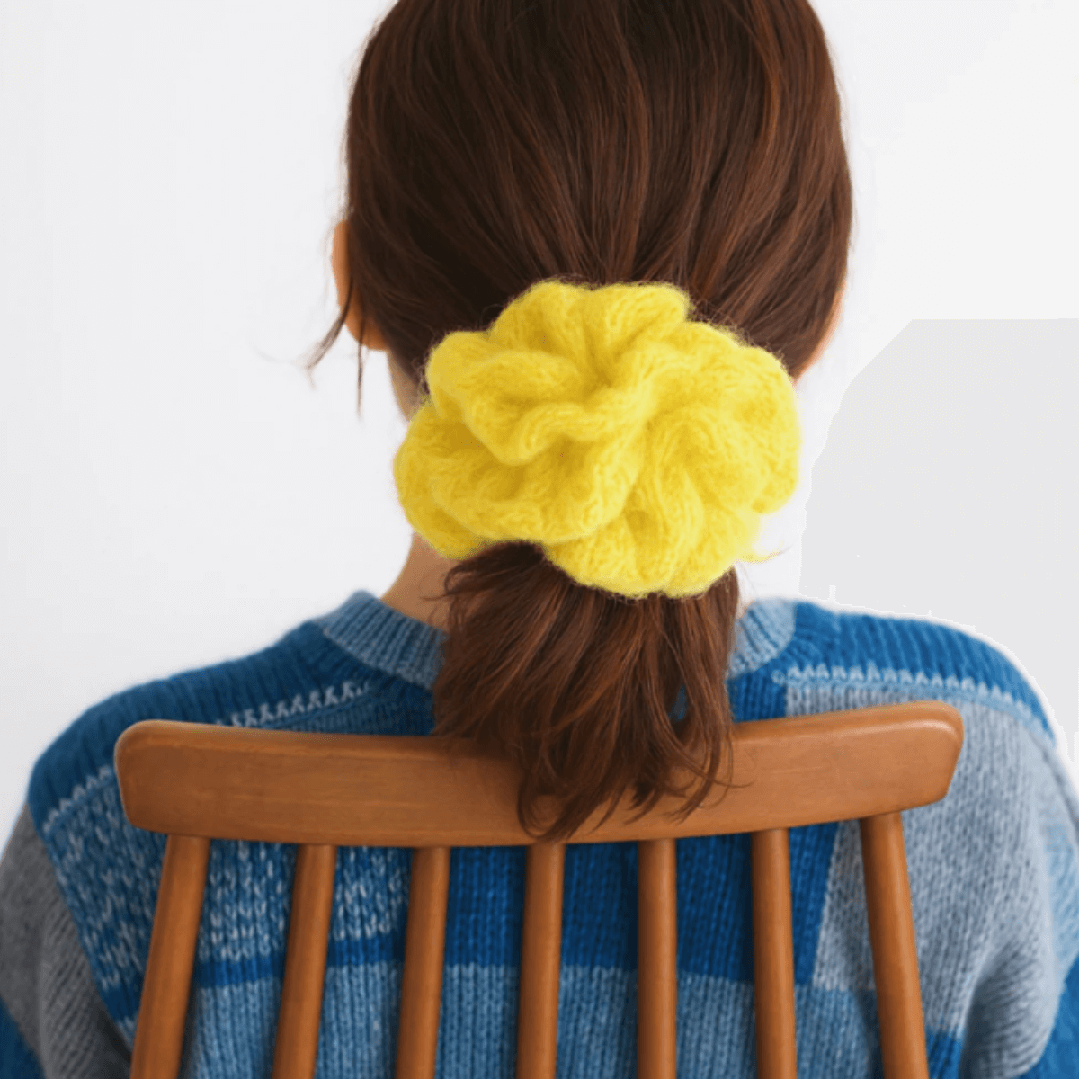 繊細なモヘアの糸とお花のスパンコールが入ったラメ糸で編むシュシュが作れるかぎ針編みキットです。鎖編み、細編み、長編みなど基本的な編み方で編むことができます。通常よりも糸を引き出しながら編むと、ふんわりとボリュームのある編み地に仕上がります。