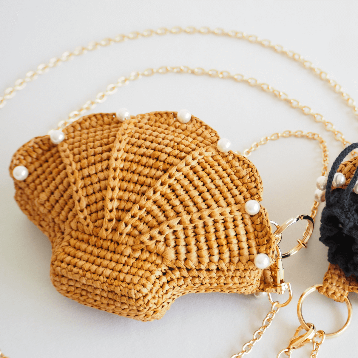 シェルデザインのチャームセットが作れるかぎ針編みキットです。カラーはステインとブラックの2種類から選べます。スカラップは、チャームとしてはもちろん、プチポシェットとしても使える2Way仕様。ちょっとしたお出かけのお供にもぴったりです。