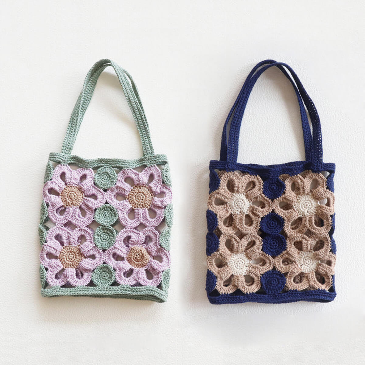 お花が可愛いミニバッグが作れるかぎ針編みキットです。お花のモチーフをつなげて、ミニバッグに仕上げます。カラーはグリーン、ネイビーからお好きな方をお選びください。中級者の方にも編みごたえのあるキットになっています。