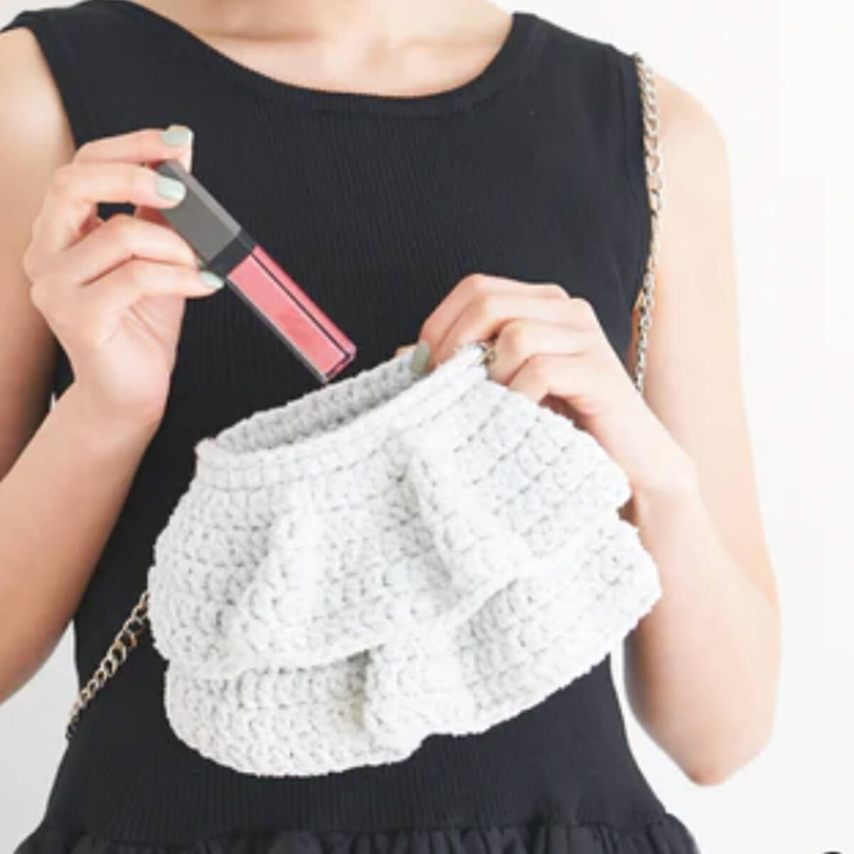 ミニサイズがかわいい大人フリルなバッグが作れるかぎ針編みキットです。コンパクトなサイズ感で細編みと長編みだけで編む事ができるので、初心者の方にもおすすめ。カラーはシルバーとブラックダイヤから選べます。
