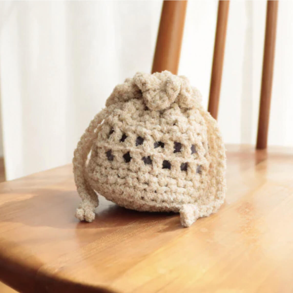 ころんとフォルムがかわいい巾着が作れるかぎ針編みキットです。口を閉じると小籠包のようなフォルムになるのがポイント。イヤホンやリップなどちょっとした小物入れに丁度いいサイズ感です。