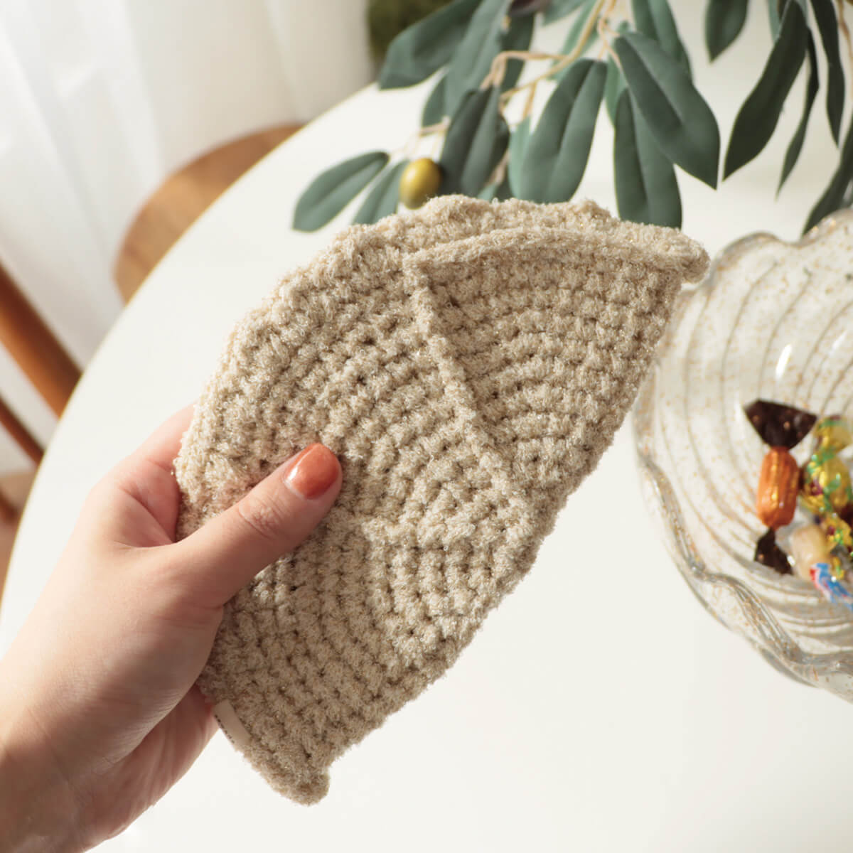 餃子のようなフォルムがポイントのシンプルなポーチが作れるかぎ針編みキットです。ラメ糸を使用しますが特有の引っ掛かりは無く、タオル地のような優しく柔らかな風合いが特徴です。