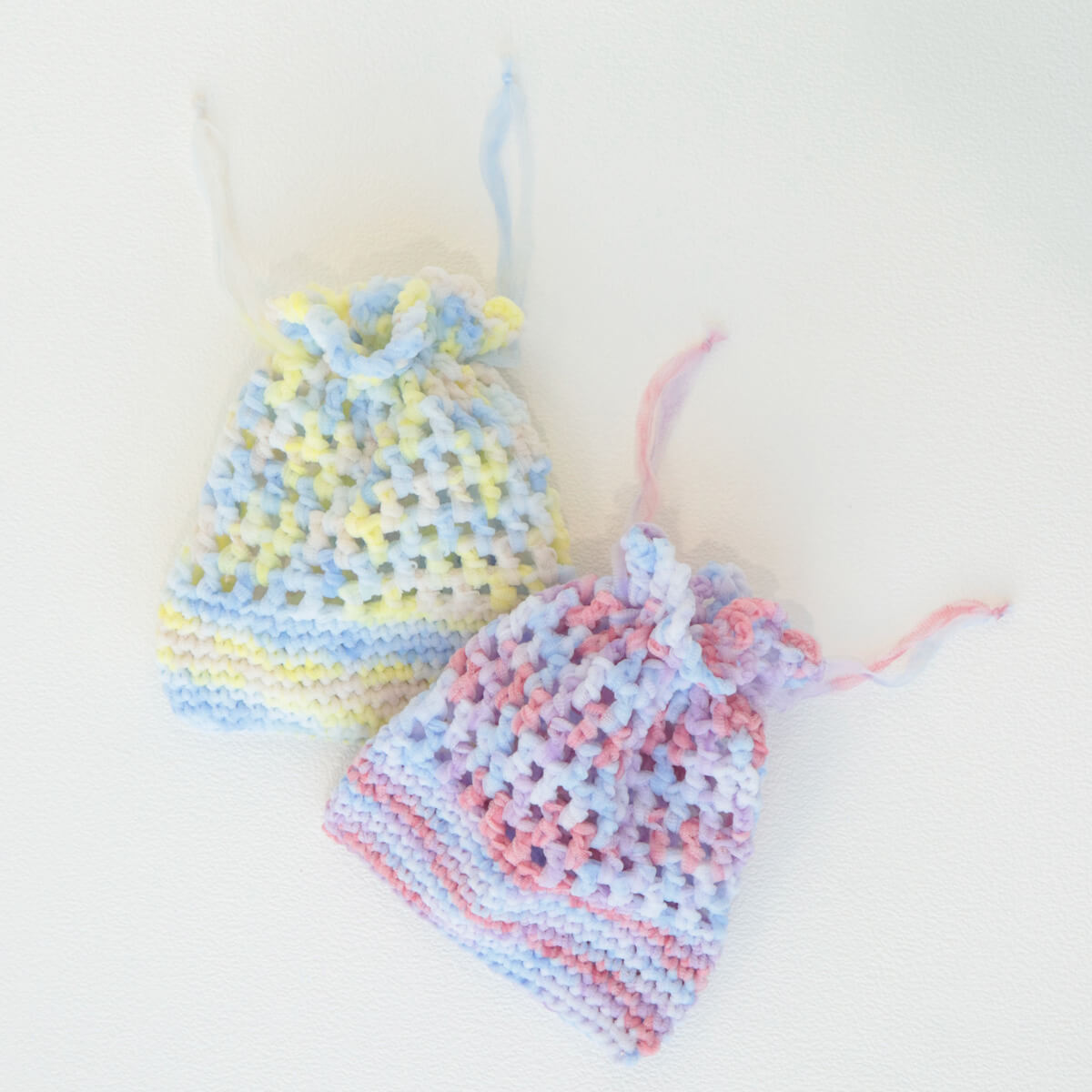なみなみ模様がひときわ目を惹く、LUNENANAさんの人気アイテムが作れるかぎ針編みキットです。おしゃれなデザインですが、長編みでざくざく編めるので一気に作れちゃいます。巾着を絞ると”くしゅっと”なるフリルもポイントですよ♪