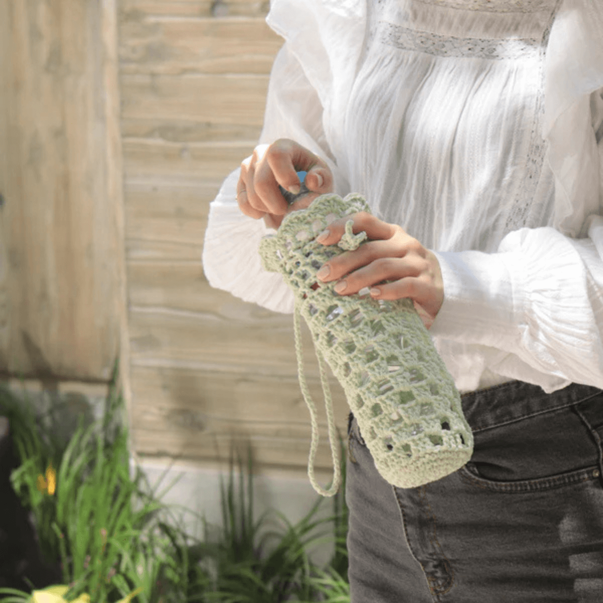 1玉でできるペットボトルカバーが作れるかぎ針編みキットです。500〜600mlサイズのボトルにちょうどよく、吸水速乾の糸なので結露しても濡れにくいのが嬉しいポイント。洗うたびに少しずつ柔らかくなり、手になじんでいきます。