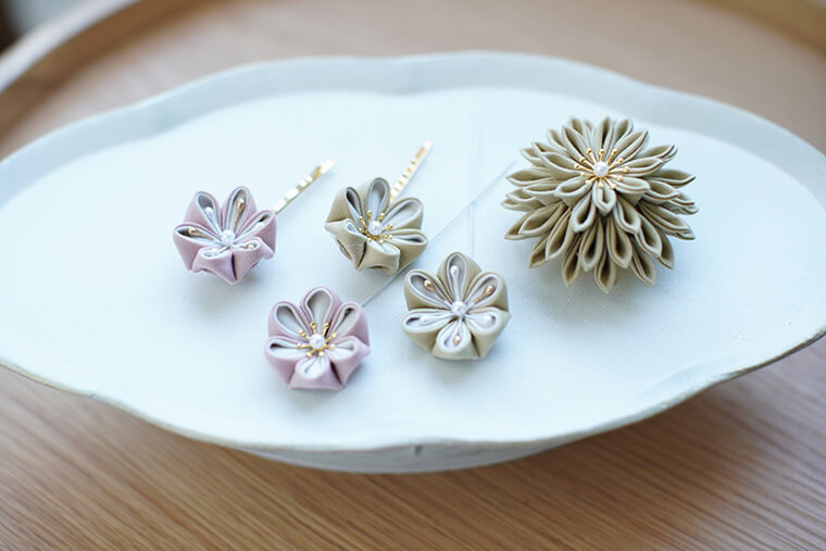 菊飾りには2wayクリップがついているので、バッグや小物に留めるなど、装いのアクセサリーとして楽しめます。梅飾りはヘアピン仕立てもできるので、ハレの日の髪飾りにおすすめです。