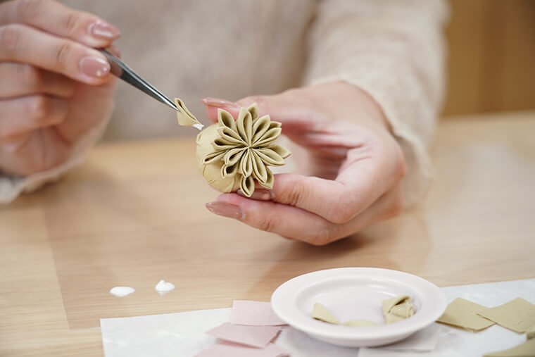 菊飾りに登場するつまみのテクニックは、最も基本的な「剣つまみ」だけ。ピンセットと指先で小さな布を丁寧に畳んでいく手仕事は、だんだん慣れてくると無心になってメディテーションのように癒されます。