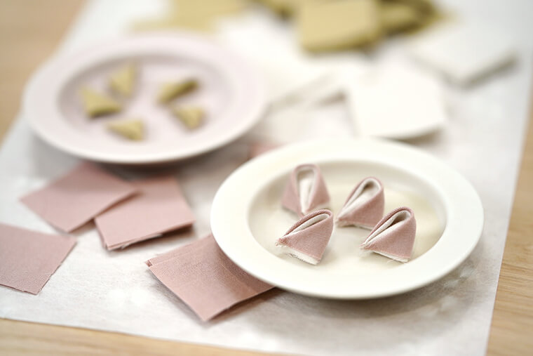 布の素材は、つまみ細工初心者でも扱いやすいコットンブロードをチョイス。しっかりと織りがつまった布は、ほどよい光沢感があり、上品な雰囲気に仕上がります。布はすべてカット済みでお届けするので、すぐに作り始めることができます。