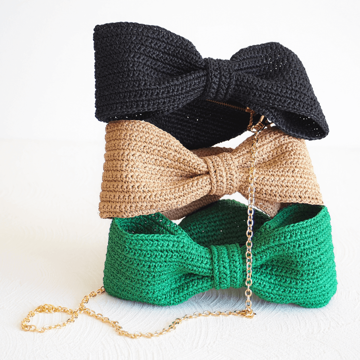 大きなリボンのついた小さなバッグ「kiki」が作れるキットです。リボンが取り外せるので、ヘアゴムをつけたりチャームにしたりなど、お好みで楽しめます。カラーはナチュラル、ブラック、グリーンの3色からお選びください。