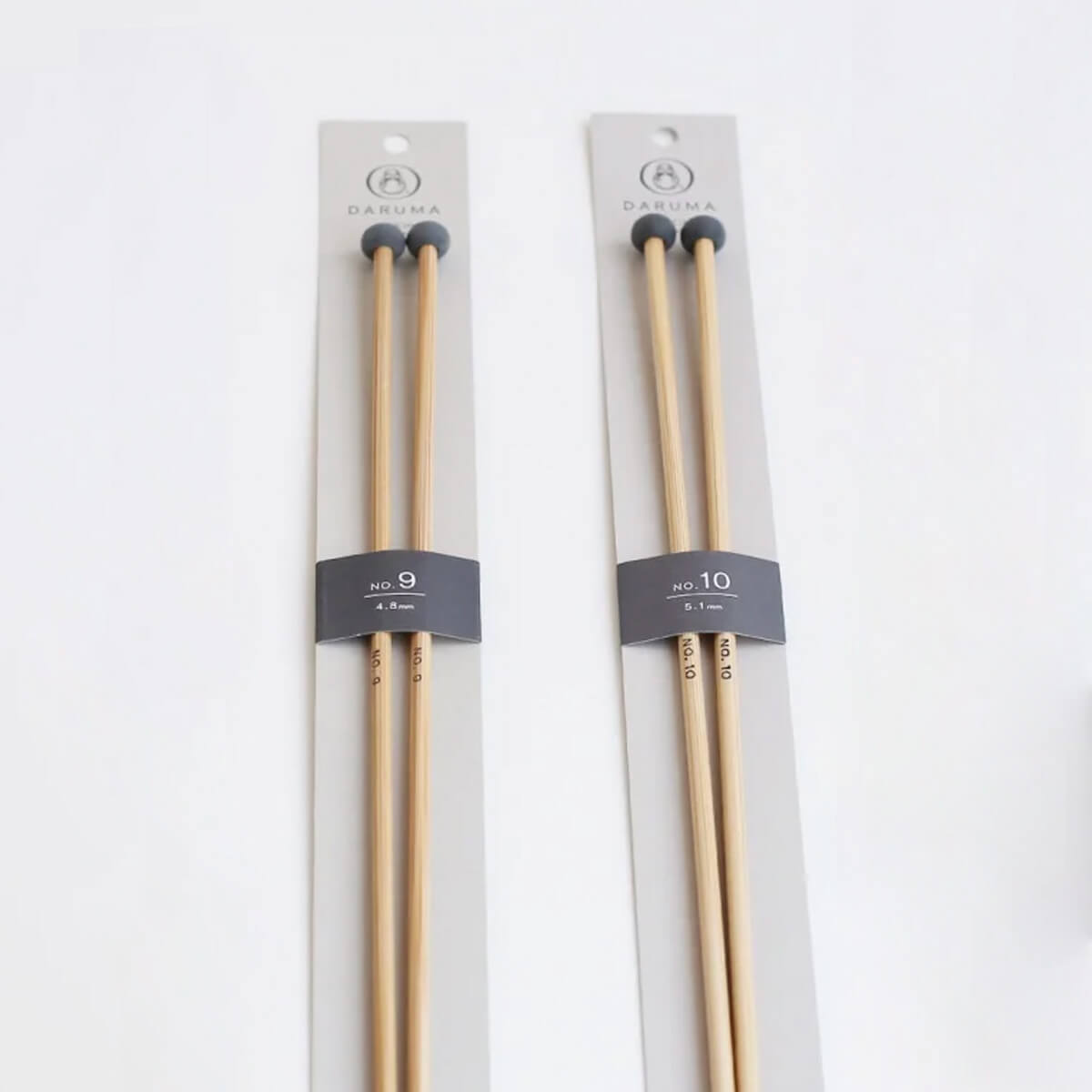プロも愛用している、Darumaのおしゃれな玉付き2本針です。日本で採れた孟宗竹を原料材に使用した竹針で、滑りすぎず滑らなすぎず、程よい滑らかさに調整されています。様々な作品作りに使いやすい9号と10号の太さの針は持っていると長く活用できます。