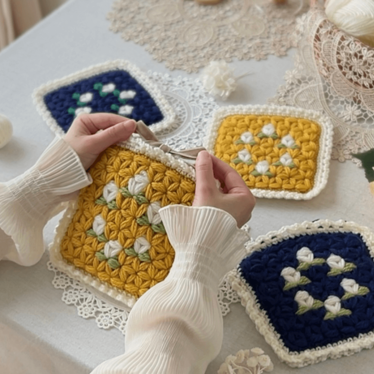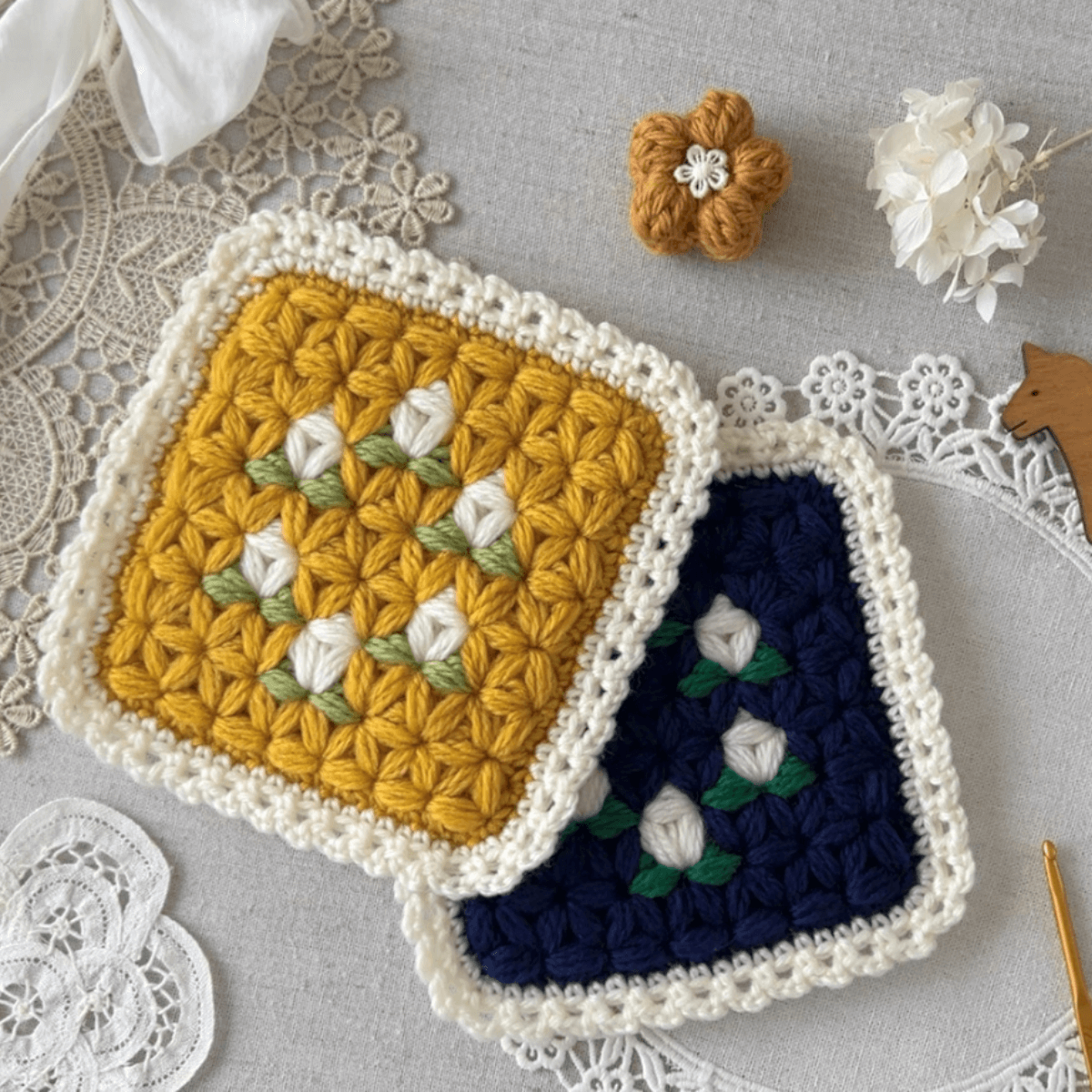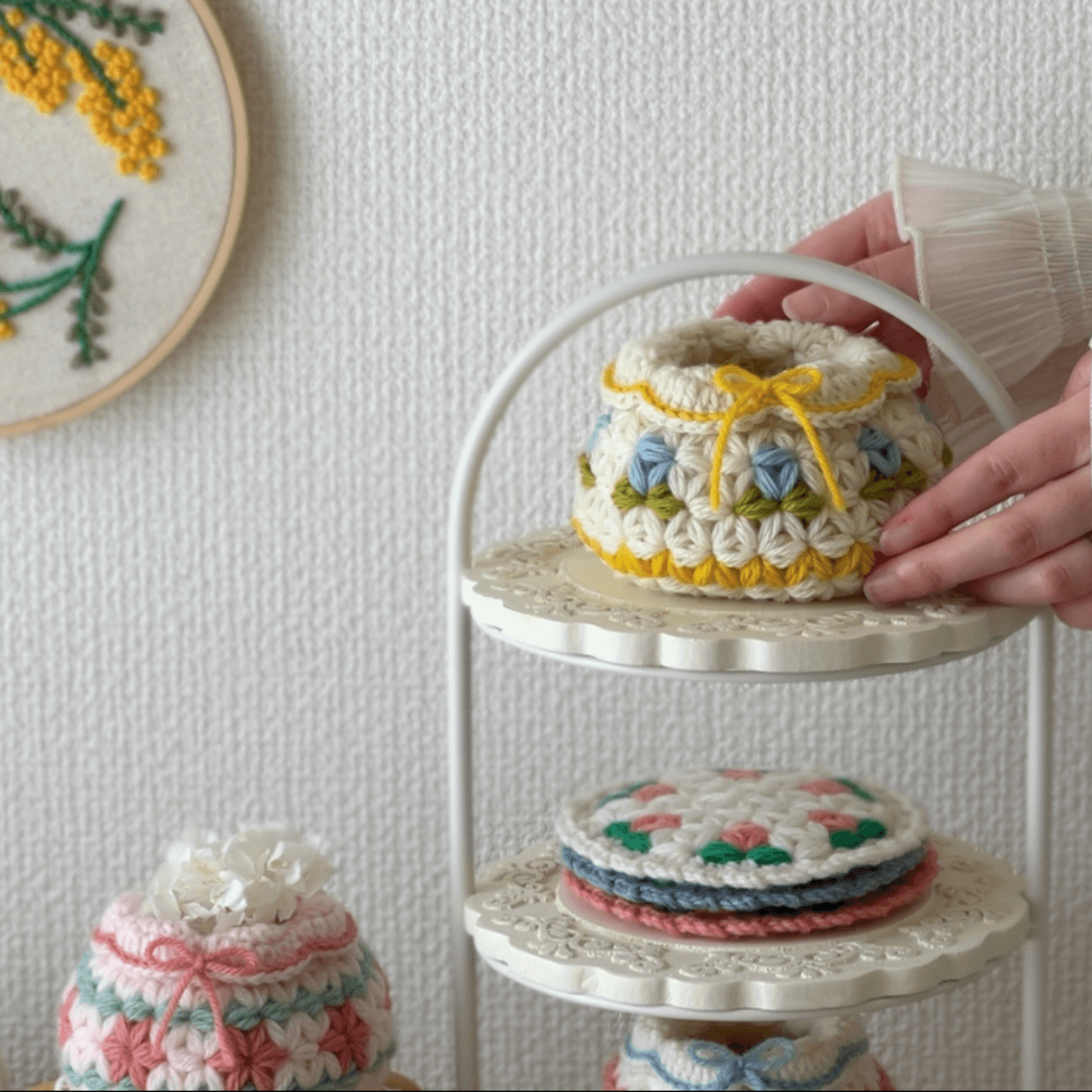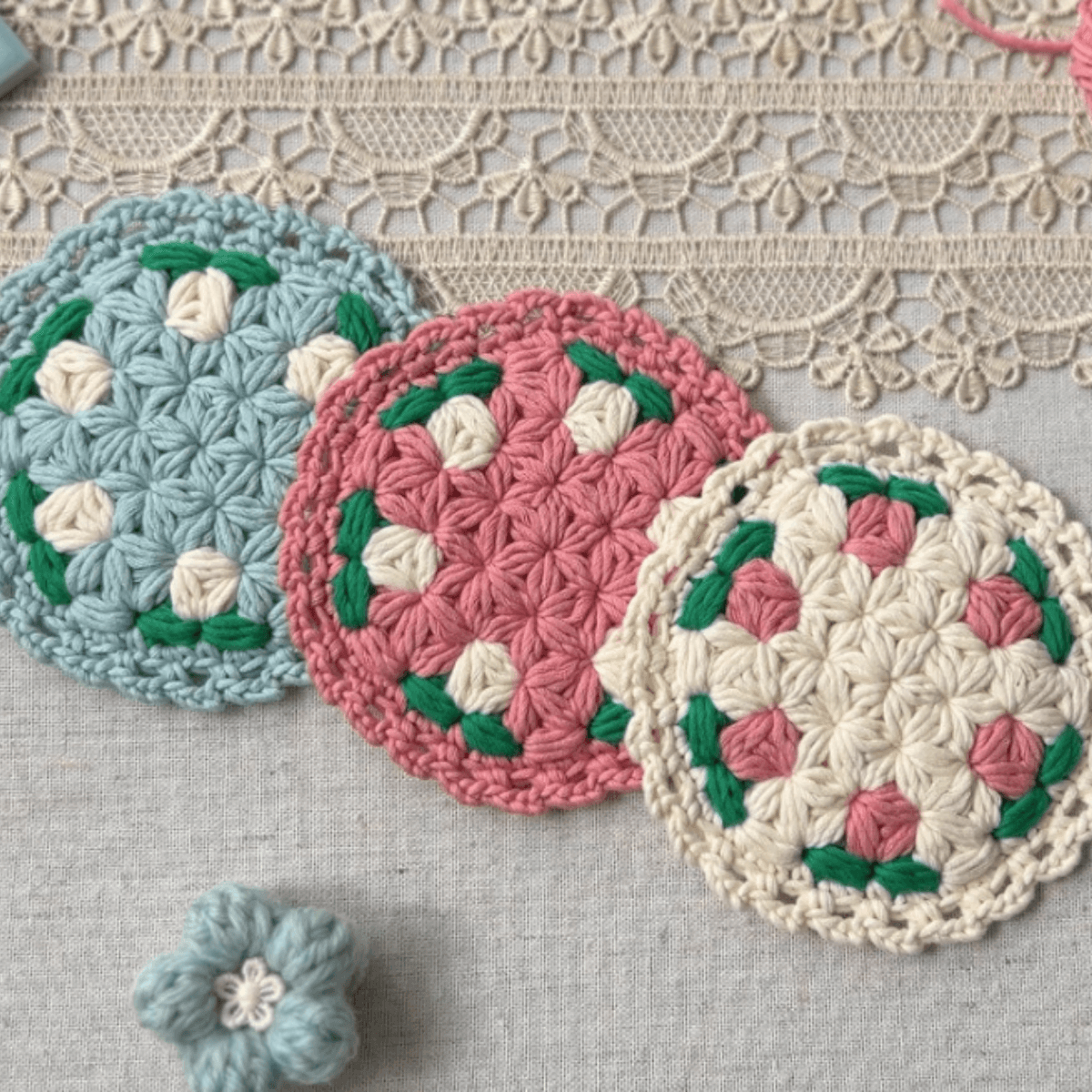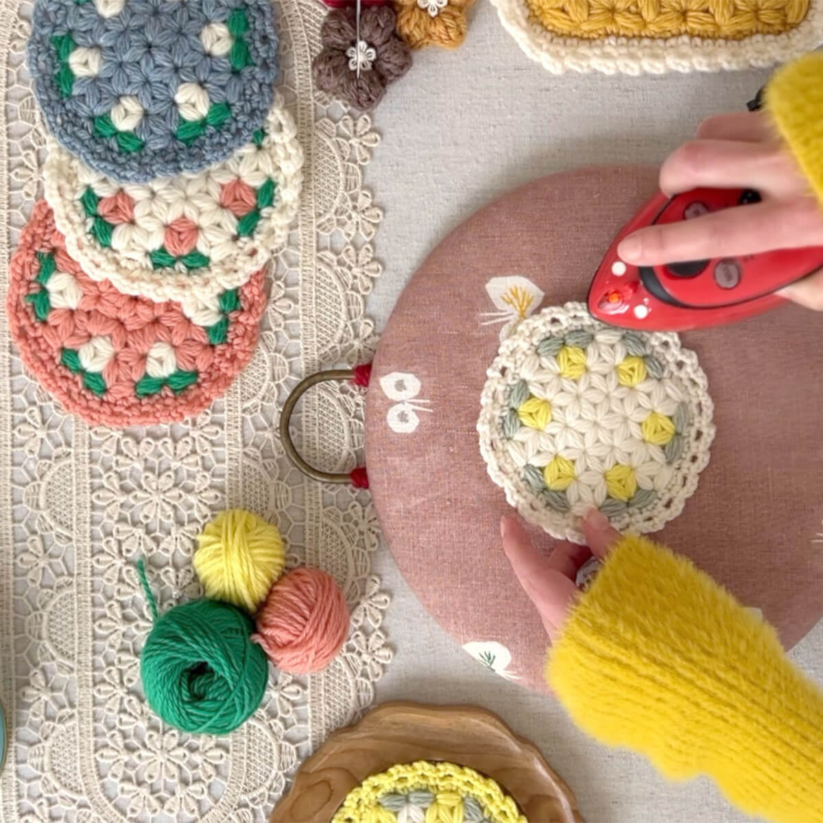 サイズがコースターより大きいので、ティーポットなども置けるサイズ感です。タペストリーのように壁にかけても可愛いですよ。作り方動画があるので安心して仕上げることができます。