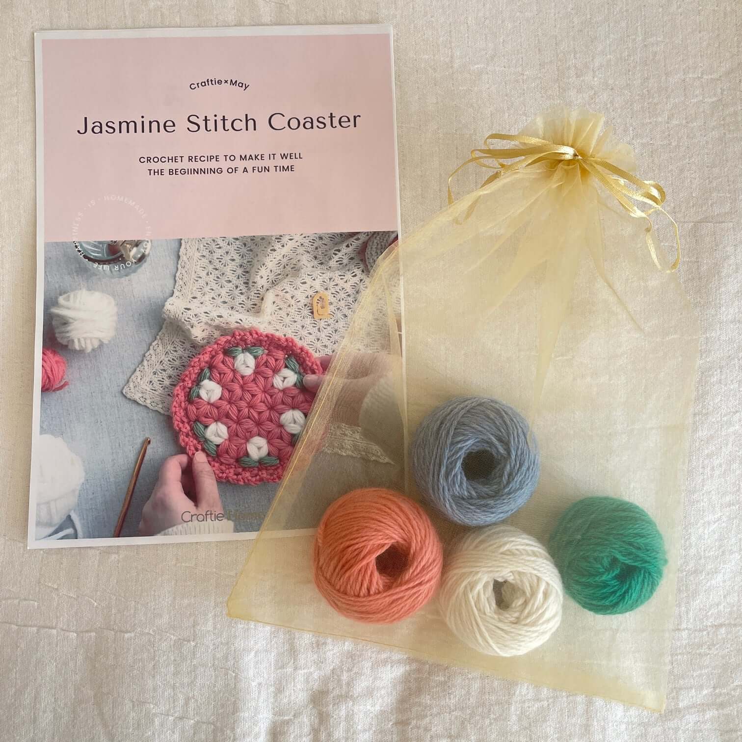 手芸にまつわる素敵な暮らしのVlog動画が人気のMayさんの、リフ編みコースターキットです。ぷっくりとしたな模様の可愛らしいコースターが作れます。