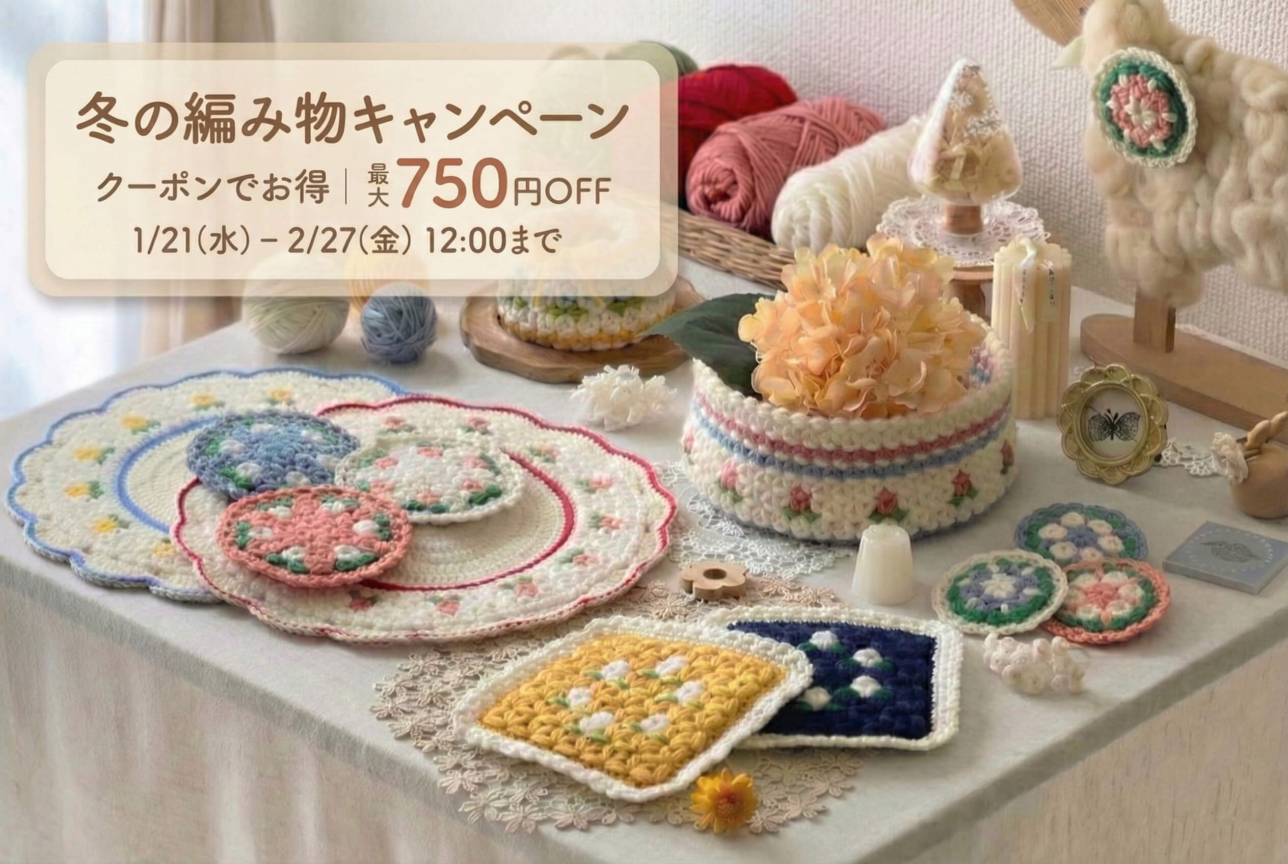 「お部屋のアクセントになる小物が欲しい」「できるだけ短時間で完成させたい」という方には、かぎ針編みがおすすめです。