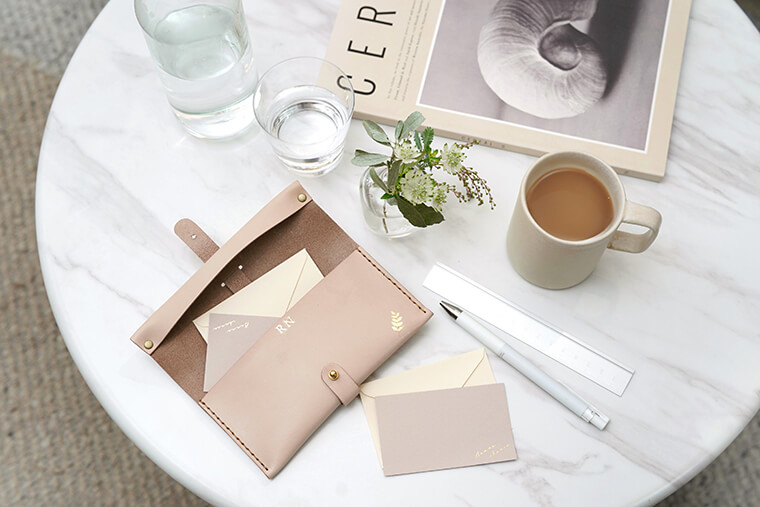 革の色は少しくすんだベージュをチョイス。普段あまり革小物を持たないという方でも取り入れやすい、やさしい雰囲気です。ポーチとして持ち歩くときはもちろん、ウォールポケットとしておうちに飾ってもインテリアにしっくりなじみます。
