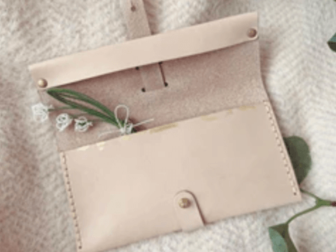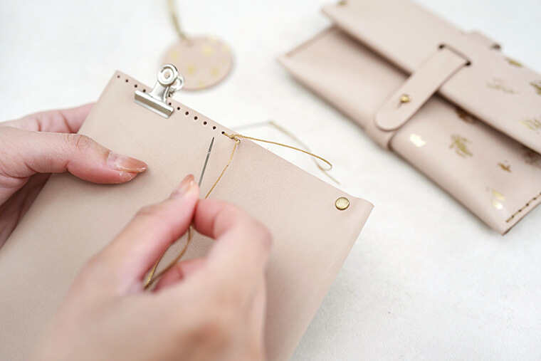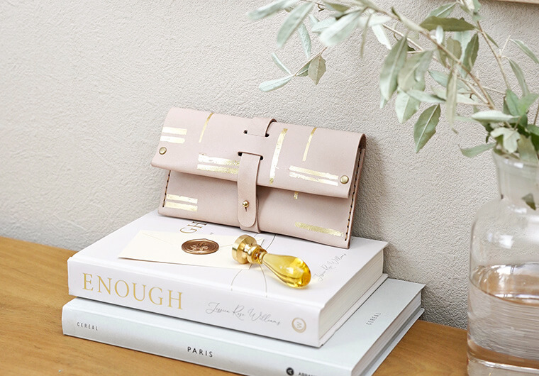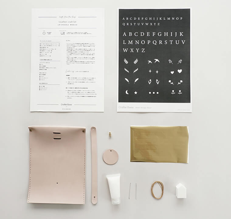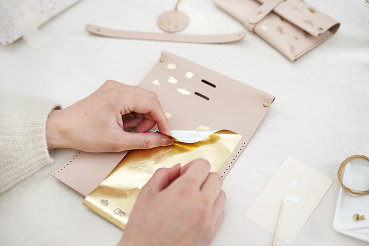今回のキットのこだわりポイントは、ゴールドの箔シート。直接、革に貼ったり、キットのデザインシートを使ってイニシャルやモチーフをつけたりできます。上質なレザーポーチにオリジナルデザインを施せるのは、Craftie Homeのキットならではの特徴です。