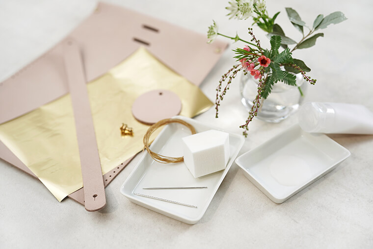 天然素材のもつ質感を味わいながら、磨き加工や縫製といった、革ならではのテクニックが体験できます。さらに、箔シートを使って世界でひとつのオリジナルデザインも作れちゃう欲張りなBoxです。